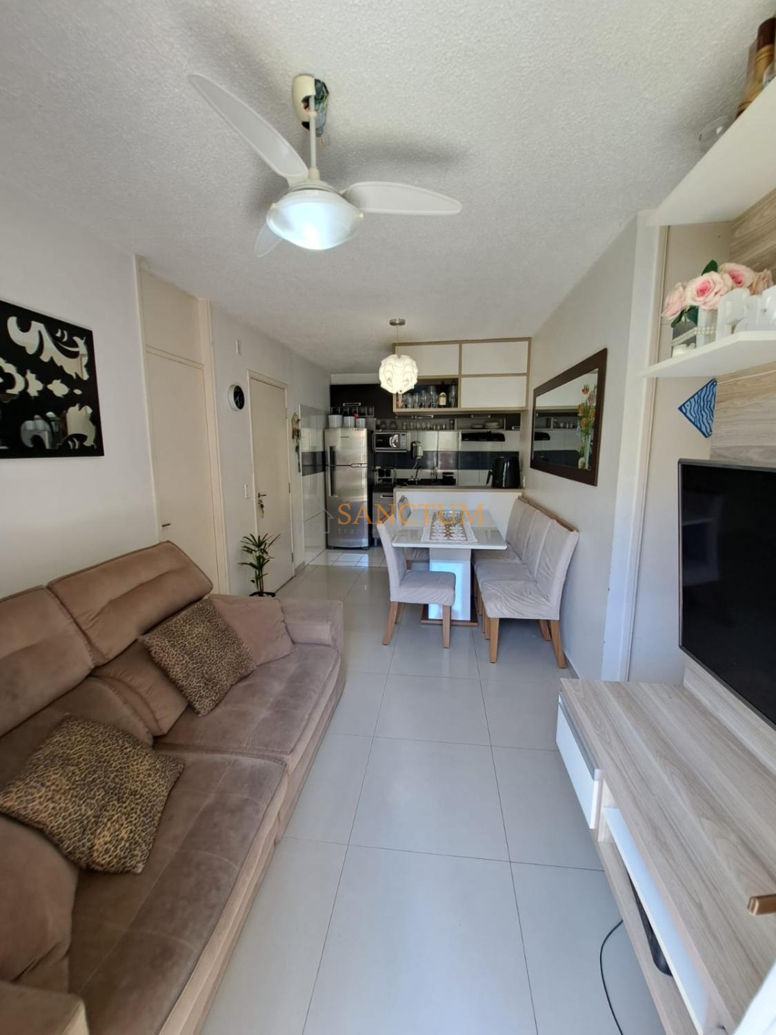 • Sala de estar e jantar aconchegante, com painel de TV e iluminação moderna