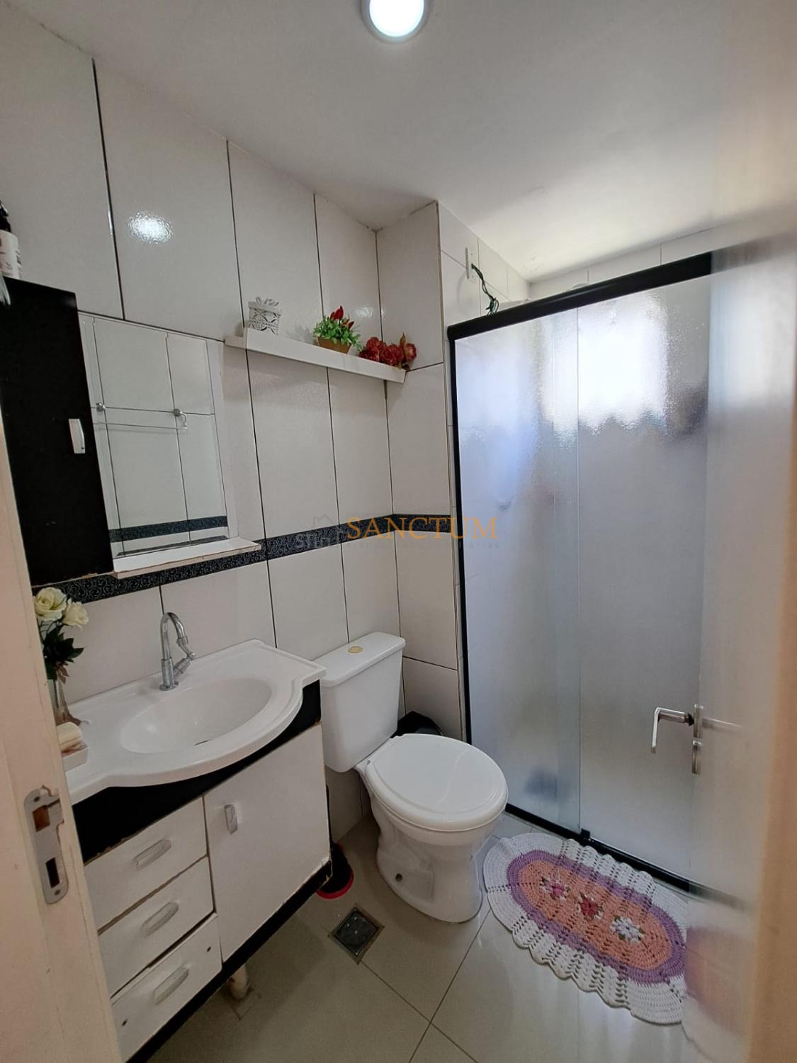 • Banheiro com box de vidro, espelho e gabinete